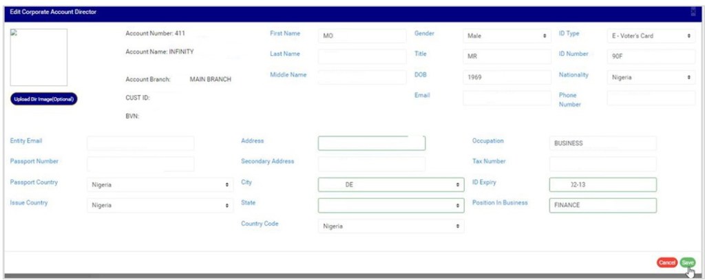 - This will display an ‘Edit Corporate Account Director’ console where you can edit the director information previously saved and also, add other details in the fields that are yet to be filled. Note that the account number, account name, account branch, customer ID and BVN cannot be changed. See an example of the console in fig. 10.4i.