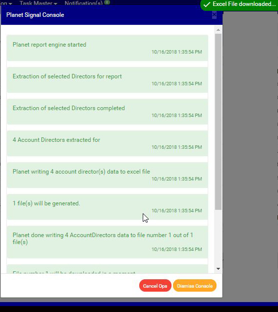 - When the download is complete, a notification will be displayed at the top of the page. See fig. 10.4t below for an example. An excel file filled with the details of selected account director information will be downloaded to your computer.
