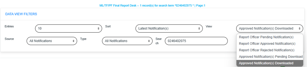 • After successful download, the Notification will move from the ‘APPROVED NOTIFICATION(S) PENDING DOWNLOAD’ list to the ‘APPROVED NOTIFICATION(S) DOWNLOADED’ list but still remain in the REPORTING OFFICER APPROVED NOTIFICATION(S) list.