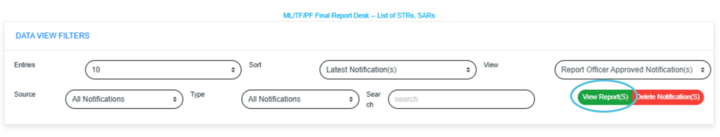When a Notification is given final approval, the Notification will move to the ‘REPORT OFFICER APPROVED NOTIFICATION(S)’ list and ‘APPROVED NOTIFICATION(S) PENDING DOWNLOAD’ list. Here, the notification can be downloaded, and details of the Notification can also be viewed. Notifications can also be downloaded under the ‘APPROVED NOTIFICATION(S) DOWNLOADED’ list. A Notification can be downloaded as many times as you desire. The generated STR/SAR will be in the XML file type. See the steps below to download an STR/SAR.
