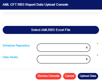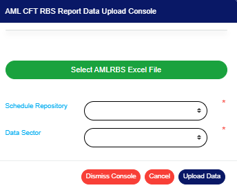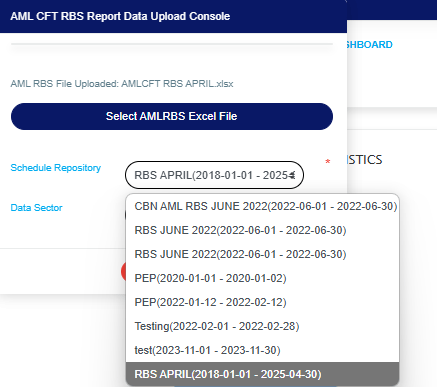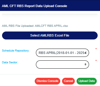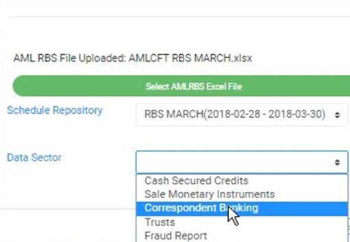 This menu was created because the AML CFT RBS report schema encompasses lots of data from various sectors of the institution. We are aware that some of these sectors may not have their monthly report data automated; hence this menu is used for the upload of such data once it is made available. This involves selecting a file filled with manually prepared sector data, and uploading its details to be included in a particular AML RBS report.