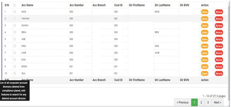 - This displays a page listing out the director information that were deleted from the general list, approved list and unapproved list. See fig. 10.7c below for an example.