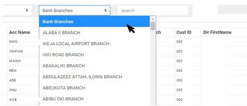 - To see deleted director information of corporate accounts for any of the branches, select the branch name from the filter box as shown in fig. 10.7e below. The default list is always for all branches of the institution.