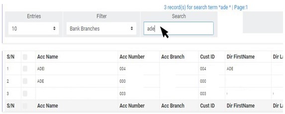 - Search for a corporate account director information by the account name, account number, director’s first name, last name or director’s BVN in the search box. See an example of a search in fig. 10.7f below. Search results will appear as you input a character in the search box.