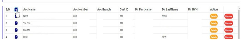 - To select/deselect all the accounts, click on the checkbox on the table title bar, that is, the checkbox between ‘S/N’ and ‘ACC NAME’. See fig. 10.7m for an example.