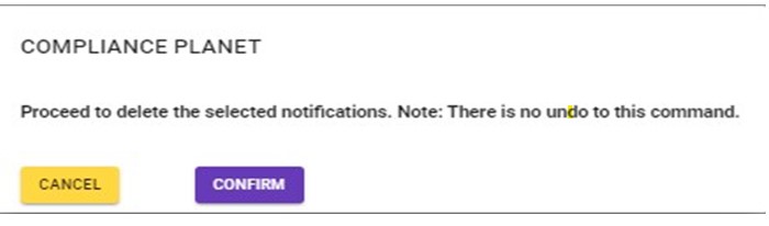 STEP 3: Clicking on “Delete Notification(s)” will display a console to confirm your selected action. See an example in Fig 6.4y below. To proceed, click on CONFIRM and to dismiss the operation, click on CANCEL.