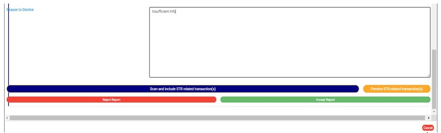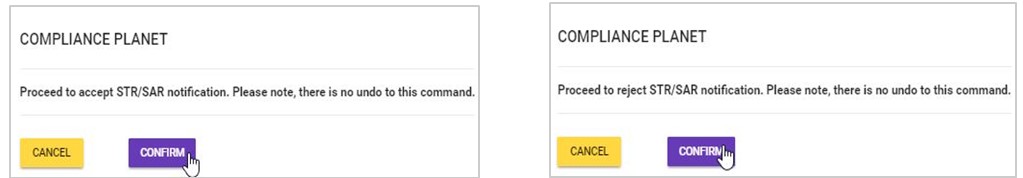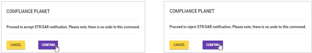 STEP 7: Click on ‘ACCEPT’ to approve the STR or ‘REJECT’ if Notification is unsatisfactory. The software will display a confirmation console to confirm your selected option. See fig. 6.5ac and 6.5ad to see examples of when you choose to ‘accept’ or ‘reject’ respectively. To proceed, click on CONFIRM and to cancel the action, click on CANCEL. Check that you are sure of your options before confirming your request to reject or accept the Notification because this step is irreversible.