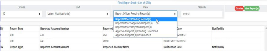 - Reporting Officer Approved Notification (s); these are STR/SAR notifications that have been treated, approved by reporting officer. Once a notification is approved by reporting officer, it joins the Approved Report(s) Pending Download list.
