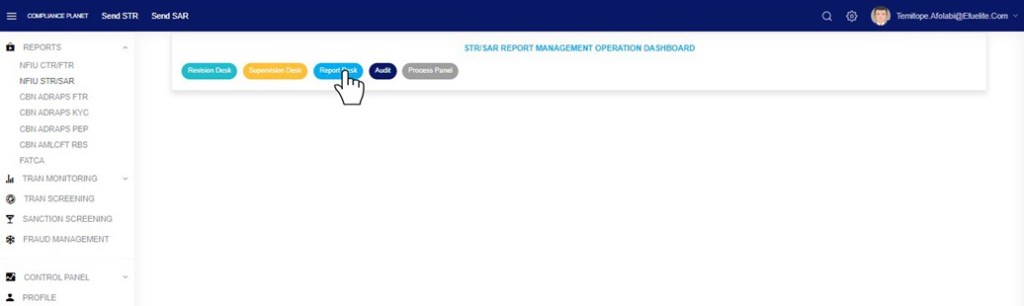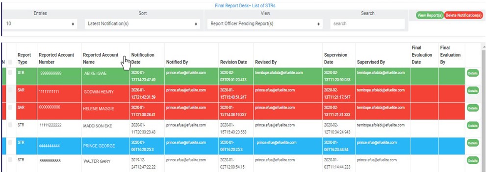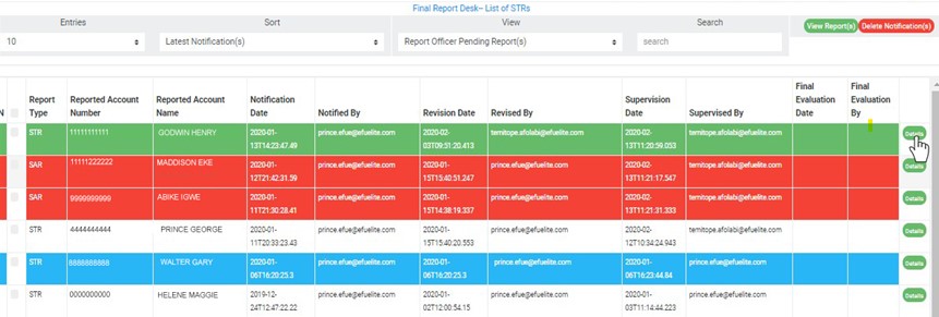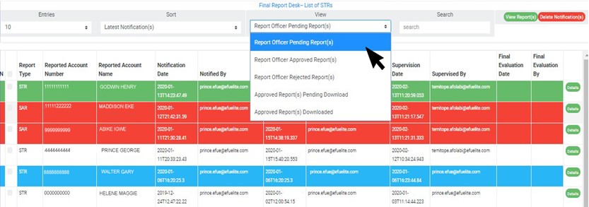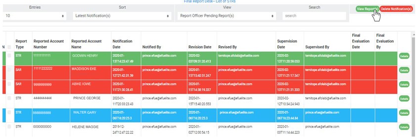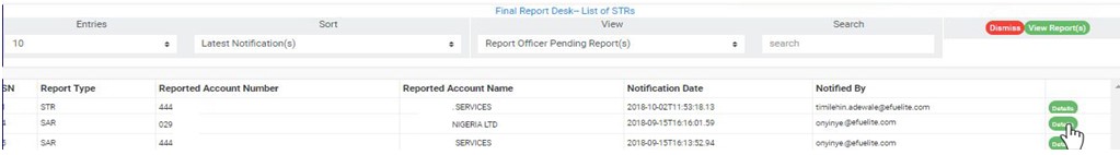 - From fig. 6.5e, 6.5f, 6.5g, 6.5h, 6.5i and 6.5j above, it can be seen that the NFIU STR report page reveals information about the notifier, the date of notification, the reported account number, the reported account name and the report type. The report type column specifies if the Notification is a suspicious transaction or a suspicious action. As stated earlier, the treatment of Notifications differs according to their report type. Now, that you already know how to locate Notifications for final review and approval on the reporting desk, here is how to treat each report type.