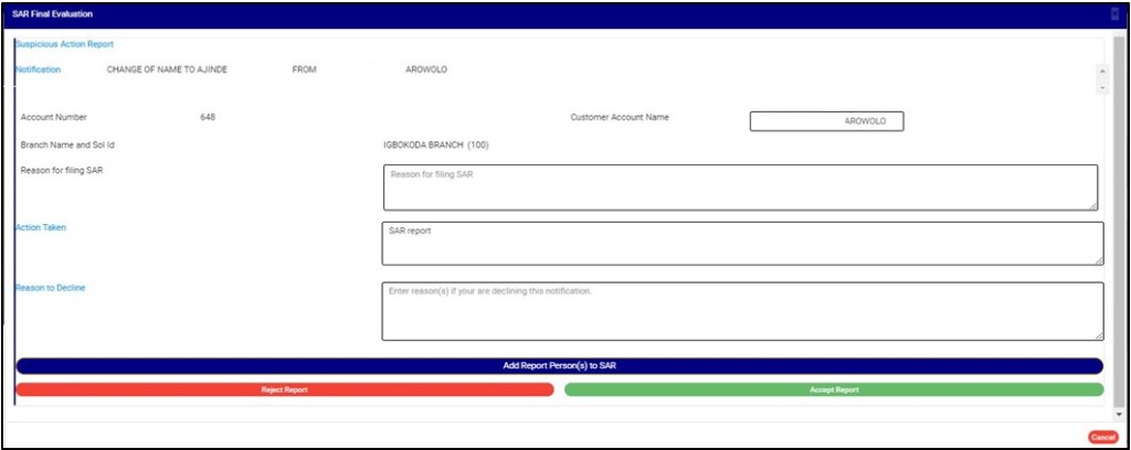 - From the example in fig. 6.5ah shown above, the final approval console for SARs reveals information about action taken and the reason(s) for the Notification, but is different from the console for a STR. This console has a feature for adding report person(s) to an SAR.