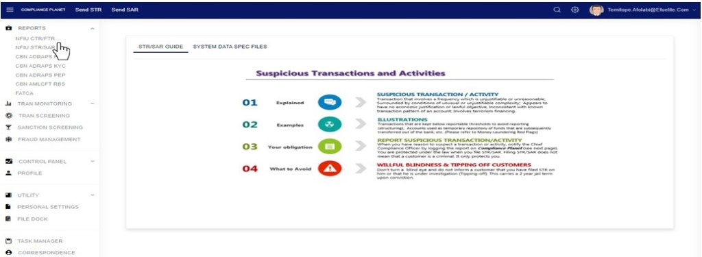 STEP 2: Click ‘NFIU STR/SAR on the drop down list. See an example in Fig 6.5b below.