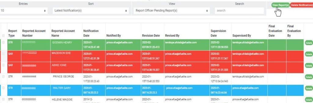 - Reporting Officer Rejected Notification(s); these are STR/SAR notifications that are not satisfactory to the reporting officer. When a notification is rejected by the reporting officer, the supervising officer will get a mail notification to revisit the STR/SAR notification and send again if need be.