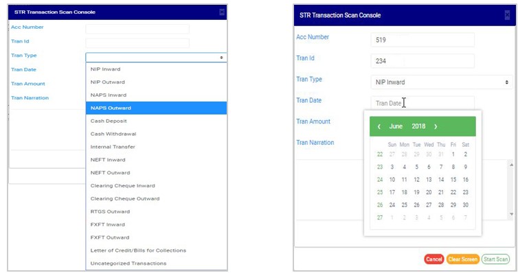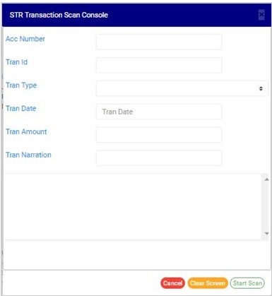 STEP 5: Click on ‘SCAN AND INCLUDE STR RELATED TRANSACTION’ to add STR related transaction(s) to the report to be generated. Adding details of related STR transactions will make your report comprehensive and well detailed. Clicking on this button will bring up another console on which you are to input the details of the related transaction. See fig. 6.5p below for an example of a scan console.