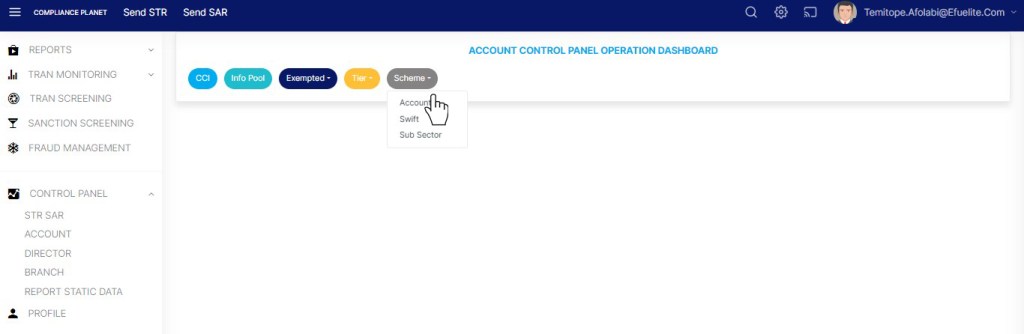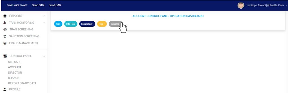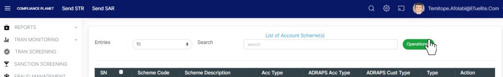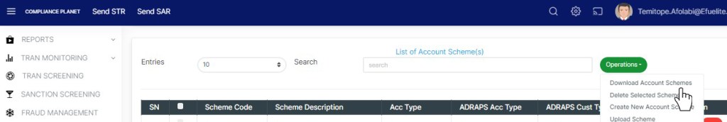 Under this control panel feature, the compliance planet provides a list of account schemes a financial institution has. The operations include editing, deleting, downloading and adding new account schemes, with options to carry out operations individually or in bulk.
