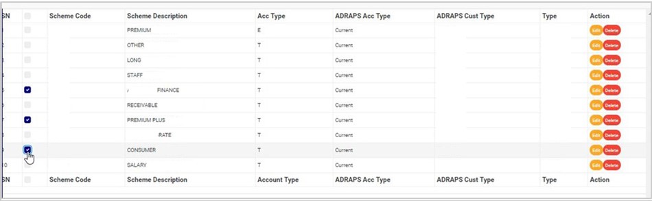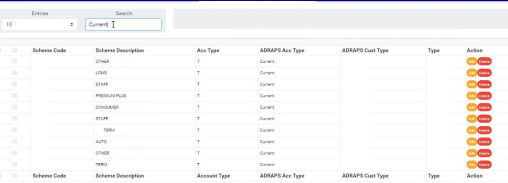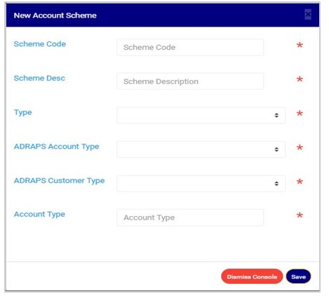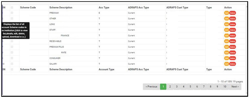 - This will display a page showing a list of all the financial institution’s account schemes. An account schemes comprises of a scheme code, an account type, an ADRAPS account type, an ADRAPS customer type and type. See fig. 12.2f for an example.