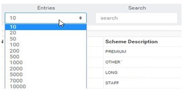 Click on the ‘ENTRIES’ box to adjust the number of account schemes you see per page. See how to adjust the number of entries per page in fig. 12.2g.
