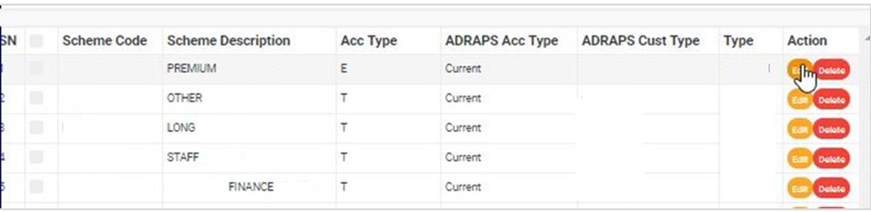 - Each Account scheme has two (2) action buttons; ‘Edit’ button and ‘Delete’ button. The different operations are explained below.