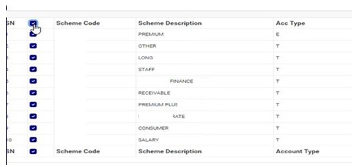 - To select or deselect all the account schemes on a page, click on the checkbox of the table title bar as in fig. 12.2o. This checkbox is between SN and Scheme Code.