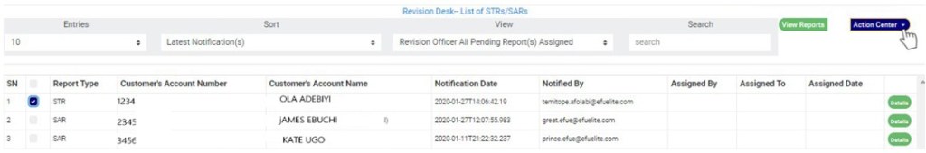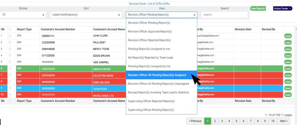 STEP 1:To re-assign Notification(s) to any member on the revision desk team, Click the VIEW box still on the NFIU STR/SAR revision page; select ‘Revision Officer All Pending Notifications assigned’, then click on the “view report” button. See fig 6.3af for an example.