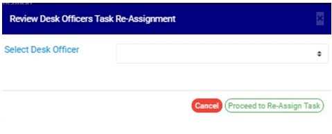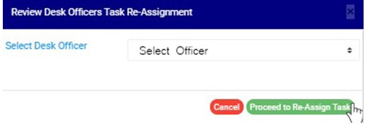 STEP 5: Clicking Re-Assign Notification will display a “Review Desk Officers Task Re-Assignment” dashboard as shown below in fig 6.3 aj below