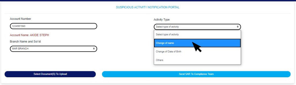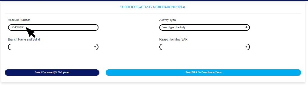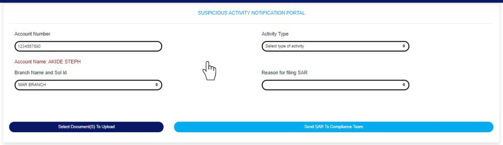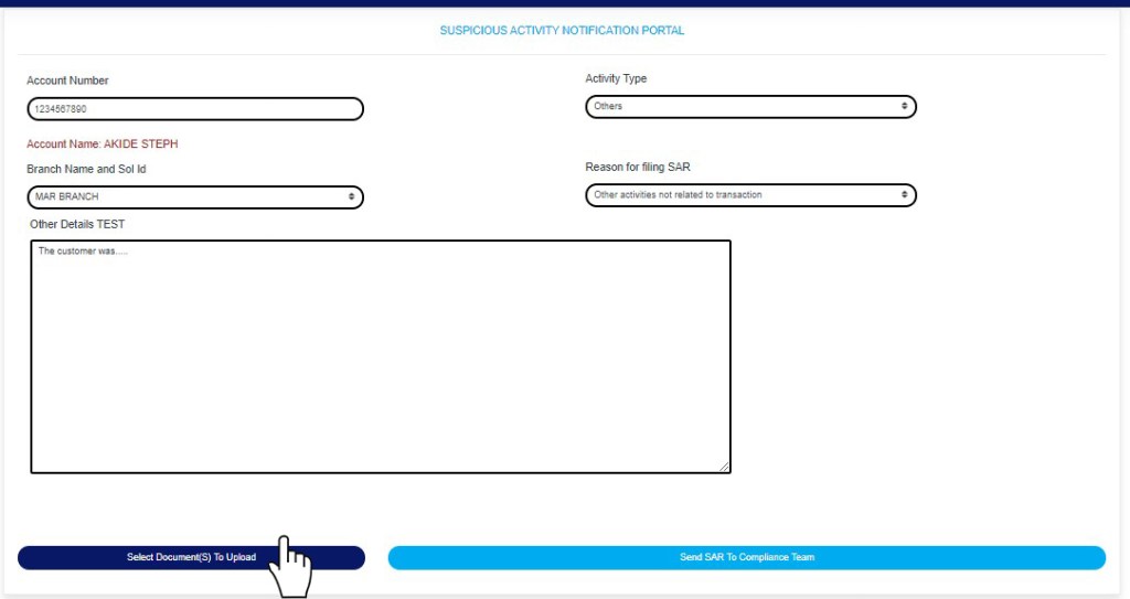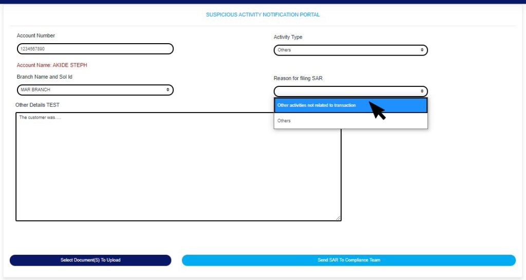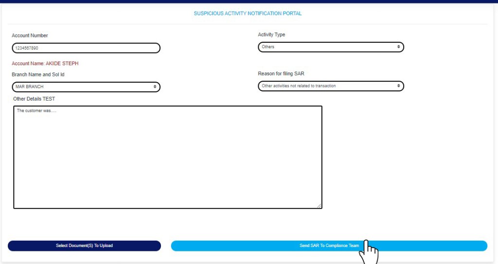 - Click on ‘SEND SAR TO COMPLIANCE TEAM’ to send the information to compliance desk. This button is at the bottom-right corner of the console. Check out this buttons in fig. 6.2.2j below.