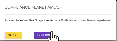 - A confirmation console will be displayed when you click on ‘SEND SAR TO COMPLIANCE TEAM’. Click on CONFIRM to proceed or click on Cancel to go back to the notification console.