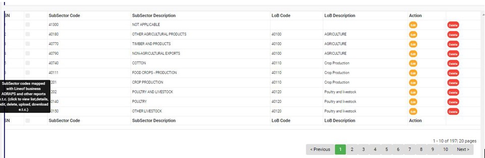 - This displays a page showing a list of all sub-sectors and their respective lines of business. See fig. 15.2f below for an example.