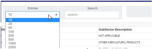 - Click on the ‘ENTRIES’ box to adjust the number of sub-sector schemes you see per page. See fig. 15.2g.