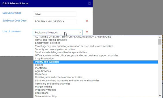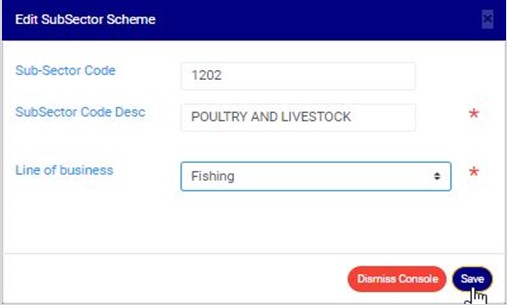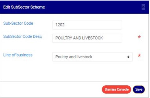 This refers to changing the details of a sub-sector scheme which includes; the sub-sector code, sub-sector description and the line of business. Here is how to edit a sub-sector scheme.