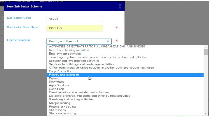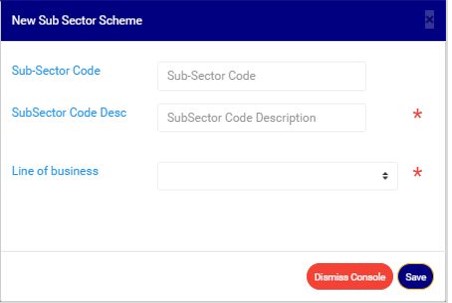 - This displays a ‘NEW SUB SECTOR SCHEME’ console. Here on this console, you are to input the details of the new sub-sector scheme which includes the sub-sector code and description and the line of business. See fig. 15.5c for an example.