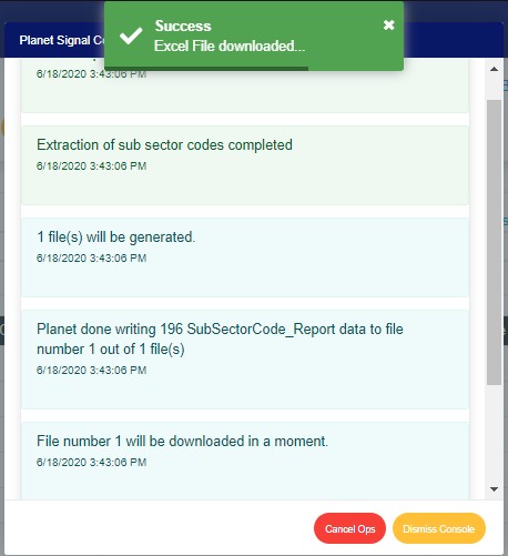 - The signal console shows on going processes. An example of a signal console is fig 6.5bb. When the upload is complete, an excel file titled, ‘Sub-sector Code Upload Report’ will be downloaded. You will be notified as shown in fig. 15.8j.