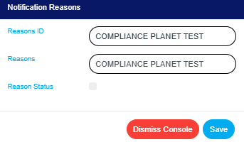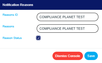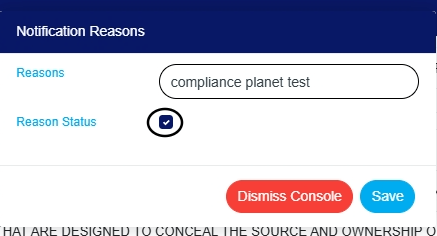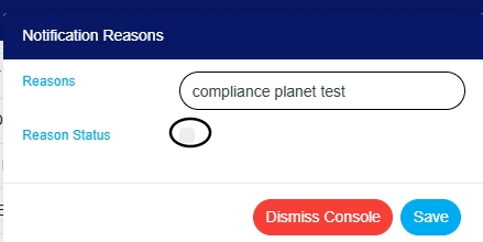 - An active notification reason will form part of the available options when sending a new STR notification on the Compliance Planet software(See section 6.2.1 for sending an STR notification). In contrast, an inactive notification reason will no longer be available when sending a STR notification on the Compliance Planet software.