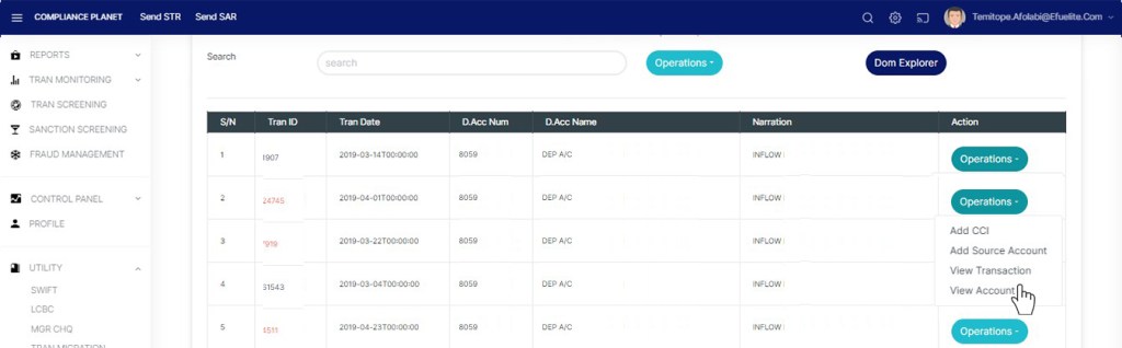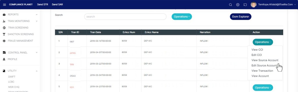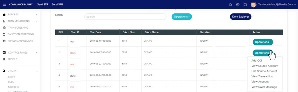 - The drop-down shows a list of actions that can be carried out on that SWIFT transaction. These actions include viewing and editing CCI attached to the transaction