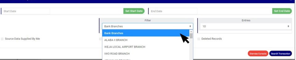 STEP 4: Click on the filter box to select a particular bank branch. (See the example in fig. 31.2f). If you want to see the transactions for all branches, select bank branches. It is the first option on the filter list.
