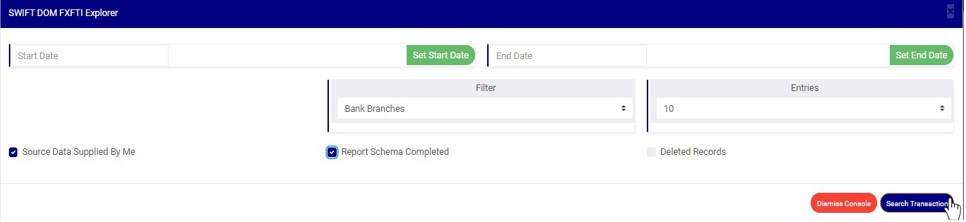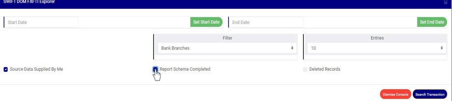 - Select ‘Report Schema Completed’ to see list of SWIFT FXFT transactions with a complete schema