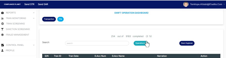 - This displays a “SWIFT OPERATIONS DASHBOARD” as in fig. 31.0c.