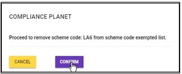 STEP 2: Click on ‘CONFIRM’ to remove the account scheme from the scheme code exempted list or ‘CANCEL’ to discontinue. If you proceed, the scheme code will be removed from the list immediately and a notification will be displayed at the top of the page. See fig. 17.4c for an example.