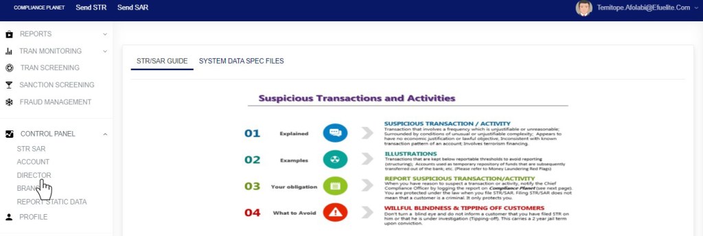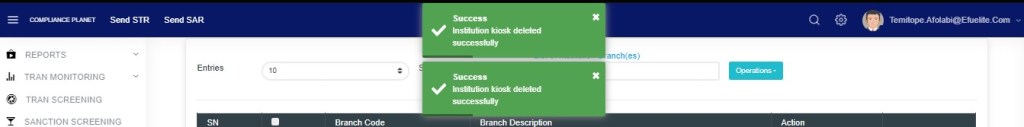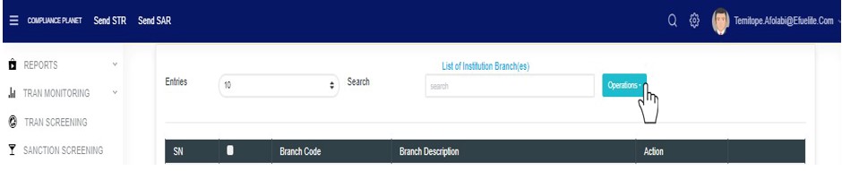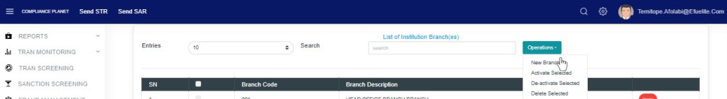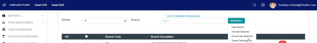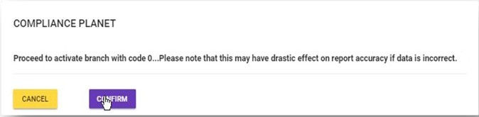Under this feature, the software provides a list of the branch codes of the financial institution and their descriptions. The operations pertaining to branch codes on the compliance planet software include creating a new branch, activating or deactivating a branch and deleting a branch, with options to carry out bulk operations also.