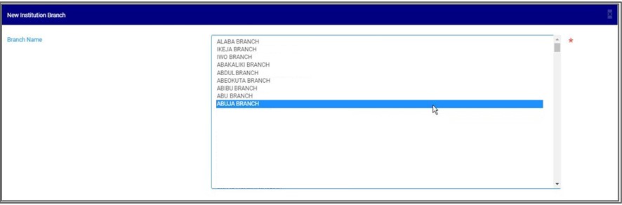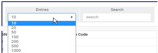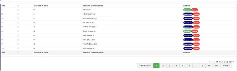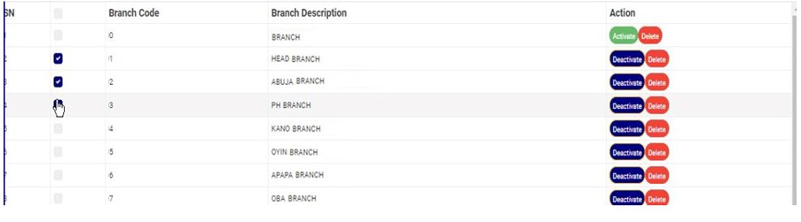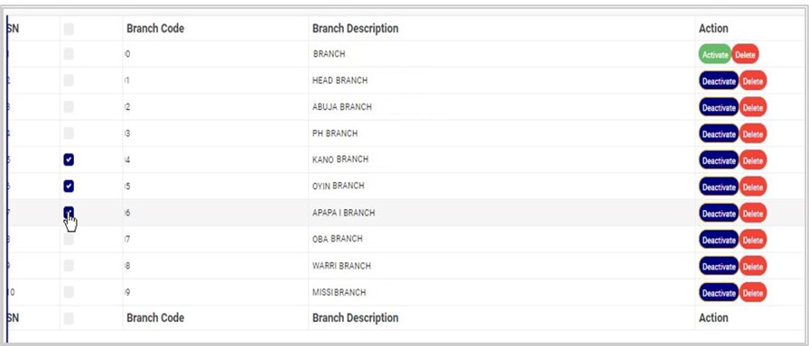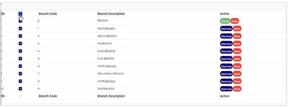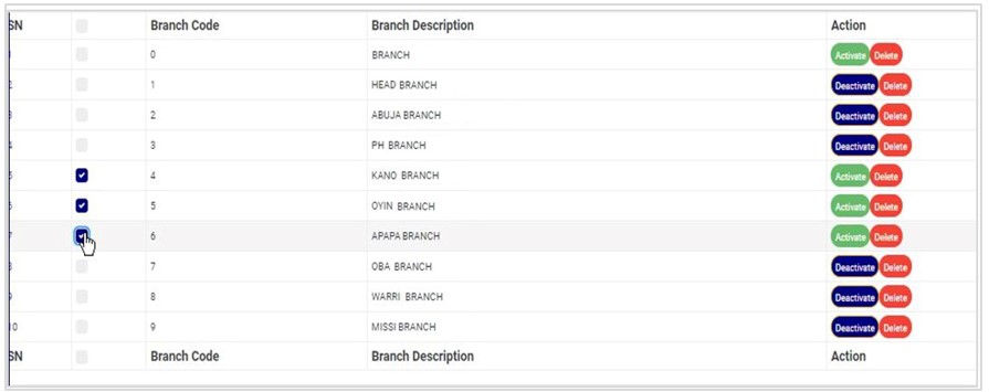 - To select or deselect all the entries on a page, click on the checkbox on the table title bar, that is, the checkbox between ‘S/N’ and ‘BRANCH CODE’. See fig. 19.8b for an example.