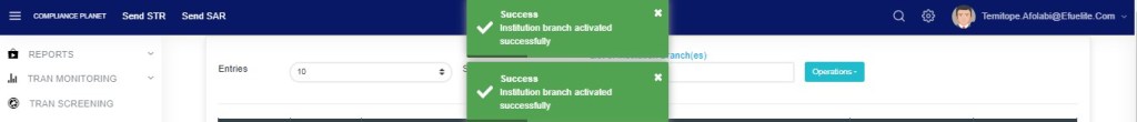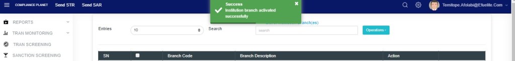 - When the operation is successful, a notification will be displayed at the top of the page and the Activate/Deactivate toggle button of the selected branch information will change from ‘ACTIVATE’ to ‘DEACTIVATE’. See fig. 19.6e below for an example.