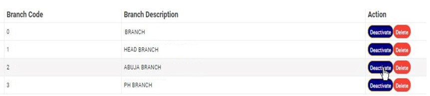 - Each branch entry has two (2) action buttons; ‘Activate/Deactivate’ toggle button and ‘Delete’ button. See these buttons in fig. 19.2f.