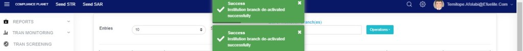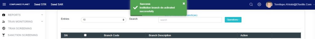 - When the operation is successful, a notification will be displayed at the top of the page and the Activate/Deactivate button of the selected branch will change from ‘DEACTIVATE’ to ‘ACTIVATE’. See fig. 19.7e below for an example.