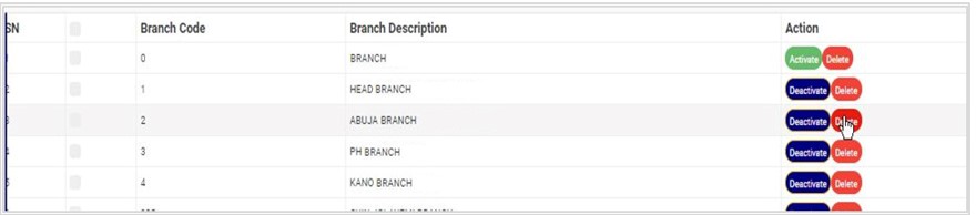 A branch information can either be active or inactive. For branches that are active, their action buttons will read, ‘DEACTIVATE’ and branches that are inactive will have ‘ACTIVATE’ buttons. The ACTIVATE/DEACTIVATE button is a toggle switch that either activates or deactivates a branch information depending on its current status. Here is how to make use of the button.