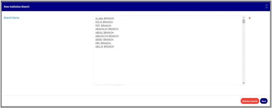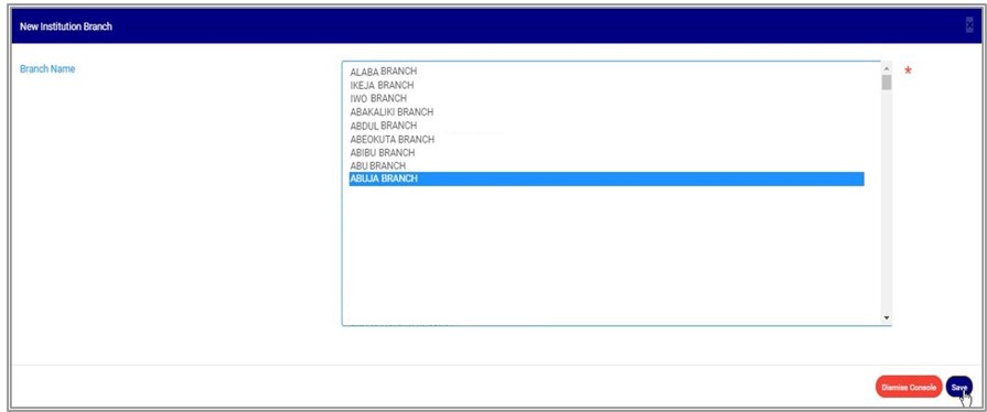 STEP 3: Click on ‘SAVE’ as in fig. 19.5e to save new branch information. Click on ‘DISMISS CONSOLE’ to close the console.