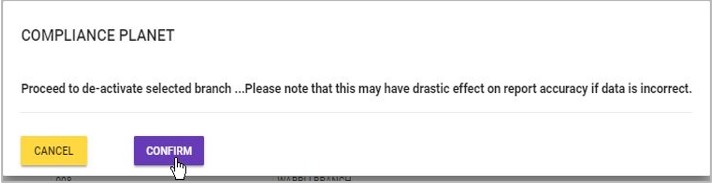 - When a branch has been successfully deactivated, the action button changes from ‘DEACTIVATE’ to ‘ACTIVATE’. See fig. 19.3i and fig. 19.3j for an example.