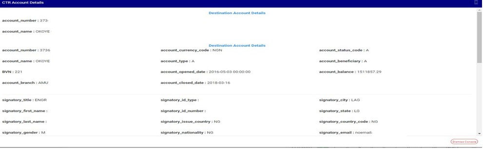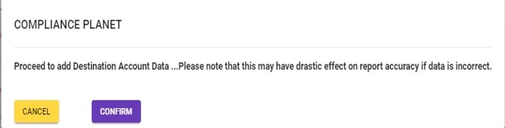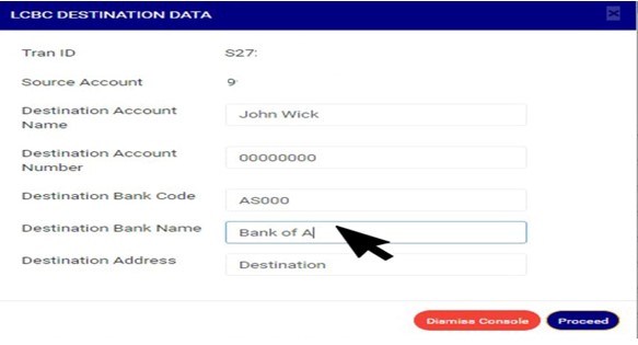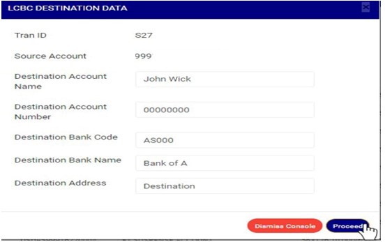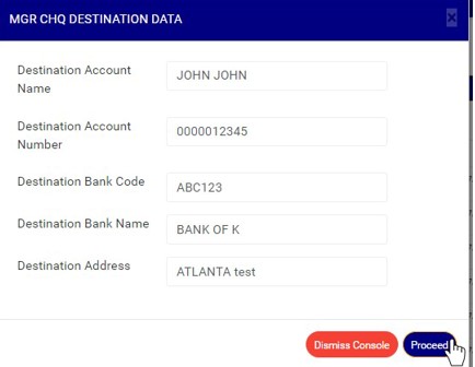 - Click on Proceed to add the Destination account data or ‘dismiss console’ to dismiss the operation. See an example in Fig 33.2z below