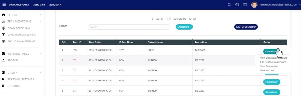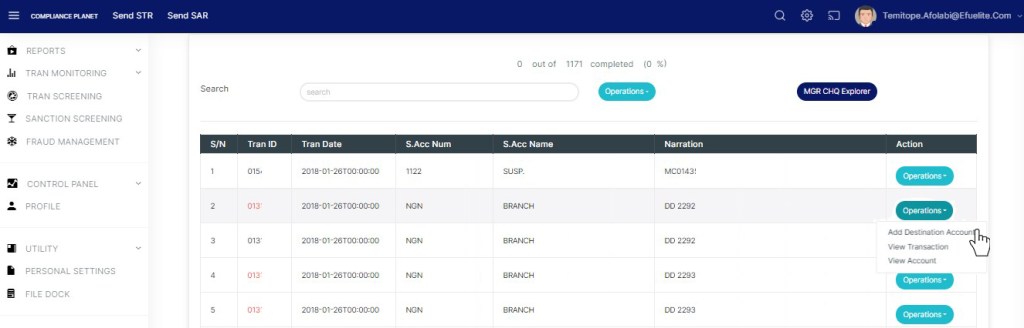 - On the Operations Dropdown, click on ‘ Add destination Account’ to add Destination account data to this transaction. This is shown in Fig 33.2w below