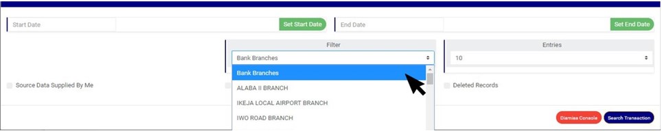STEP 3: Click on the ‘filter’ box to select a bank branch. If you want to see the transactions for all branches, select bank branches. It is the first option on the filter list.