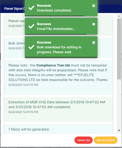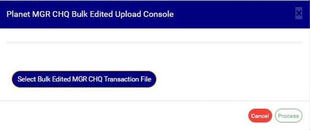 - This will display a ‘Planet MGR CHQ Bulk Edited Upload Console’ as in Fig33.3k below.