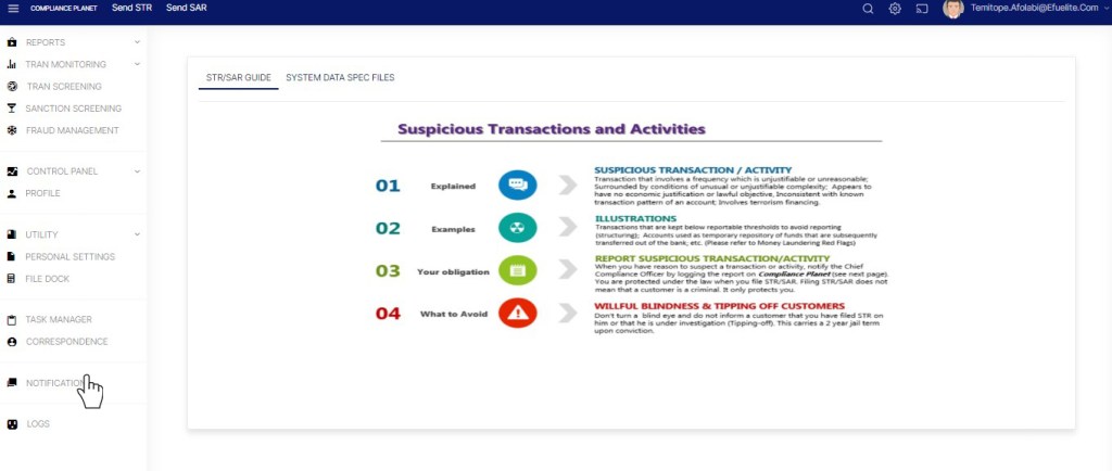 This section provides a guide on how to perform operations pertaining to notifications on the Compliance Planet software, with step-by-step instructions and pictures.